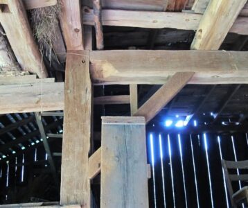 “Heritage Haven” saltbox frame in hand-hewn pine, 42×60 with traditional lines and drawings available, ideal for a classic barn home or venue.