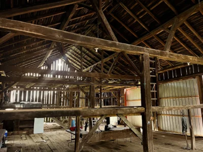 Circa-1900s, 36′ x 64′ hand-hewn oak barn frame with mortise-and-tenon joinery. Available as-is or fully restored, precisely tagged, and delivered ready to re-erect, installation support is available.